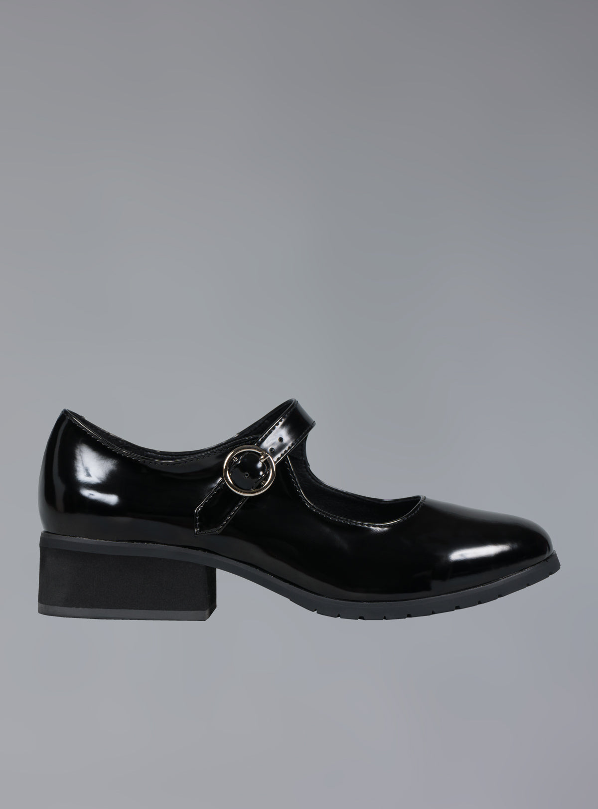 Vegan leather Mary Janes with a bit of shine, an adjustable buckle strap and a 1" heel.