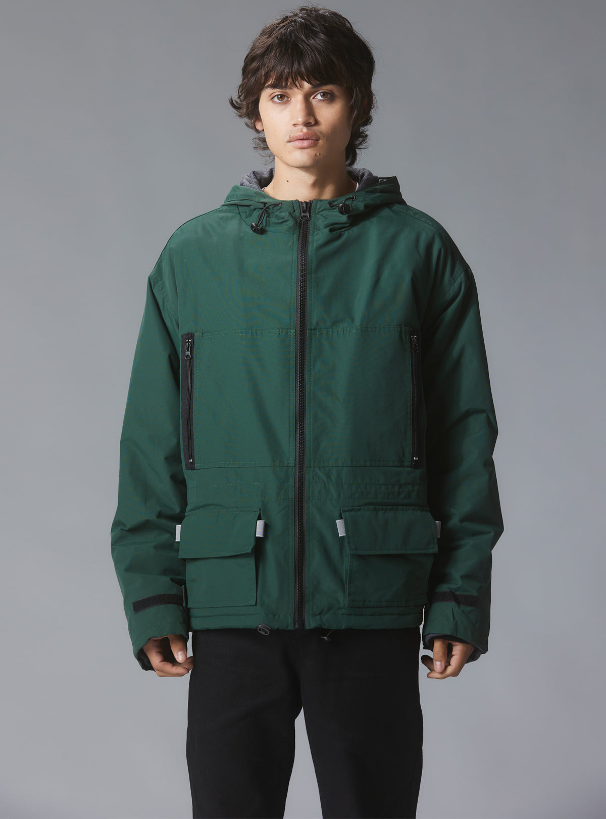The Malt Jacket is a UNISEX tech utility jacket with features designed for utility and convenience. It has pockets throughout for easy storage, reflective taping for nighttime visibility, a hooded top, adjustable side straps for a personalized fit, and a slightly cropped boxy fit with full jersey lining. Bungee pulls at the waist, bottom hem, and hood. Also features velcro straps at the wrists.
