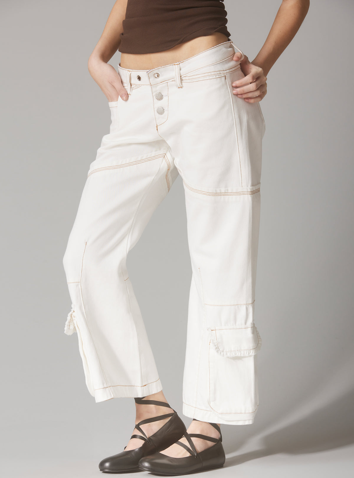 The Nefer Pant is a midrise, midweight denim pant with contrast stitching throughout, cargo flap pockets at the leg, and a slightly cropped flare fit. Exposed button closure, side welt pockets and back pack pockets. Fit is true to size.