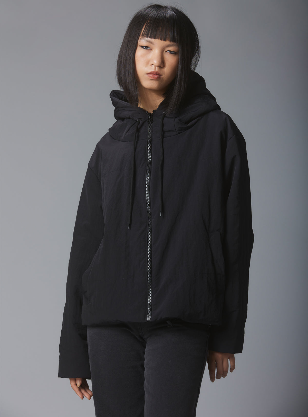 The Neiro Jacket is a wind-resistant, technical hooded jacket with an oversized fit. Full zip front closure with branded hardware, side welt pockets, tonal drawstring at collar, and bungee pulls at the bottom hem.