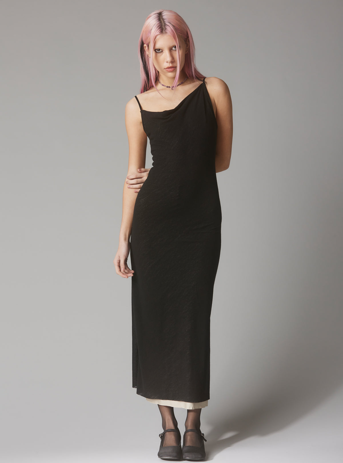 The Nexus Dress is a bias-cut double-layer dress featuring raw edges and adjustable shoulder straps which allow for an asymmetrical or symmetrical bust line.