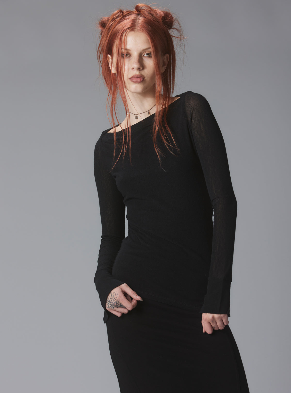 The Nexus Top is a mesh long sleeve knit top with a wide-square neck, asymmetrical hem, and cuffs with slits. Comes in multiple colorways.
