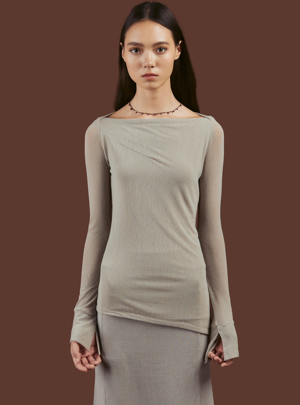 The Nexus Top is a mesh long sleeve knit top with a wide-square neck, asymmetrical hem, and cuffs with slits. Comes in multiple colorways.