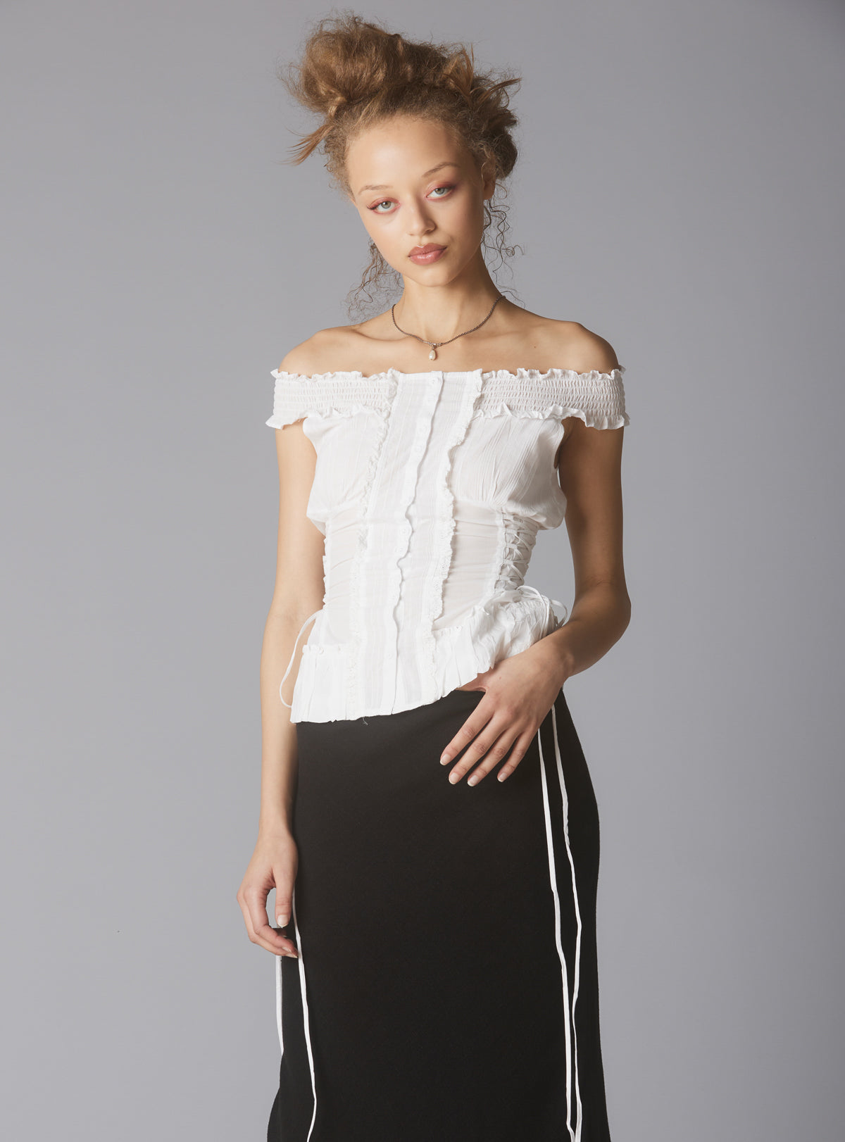 Off-the-shoulder top with functioning lacing on each side of the was it for wearer comfortability and styling. Has a functioning front button closure.
