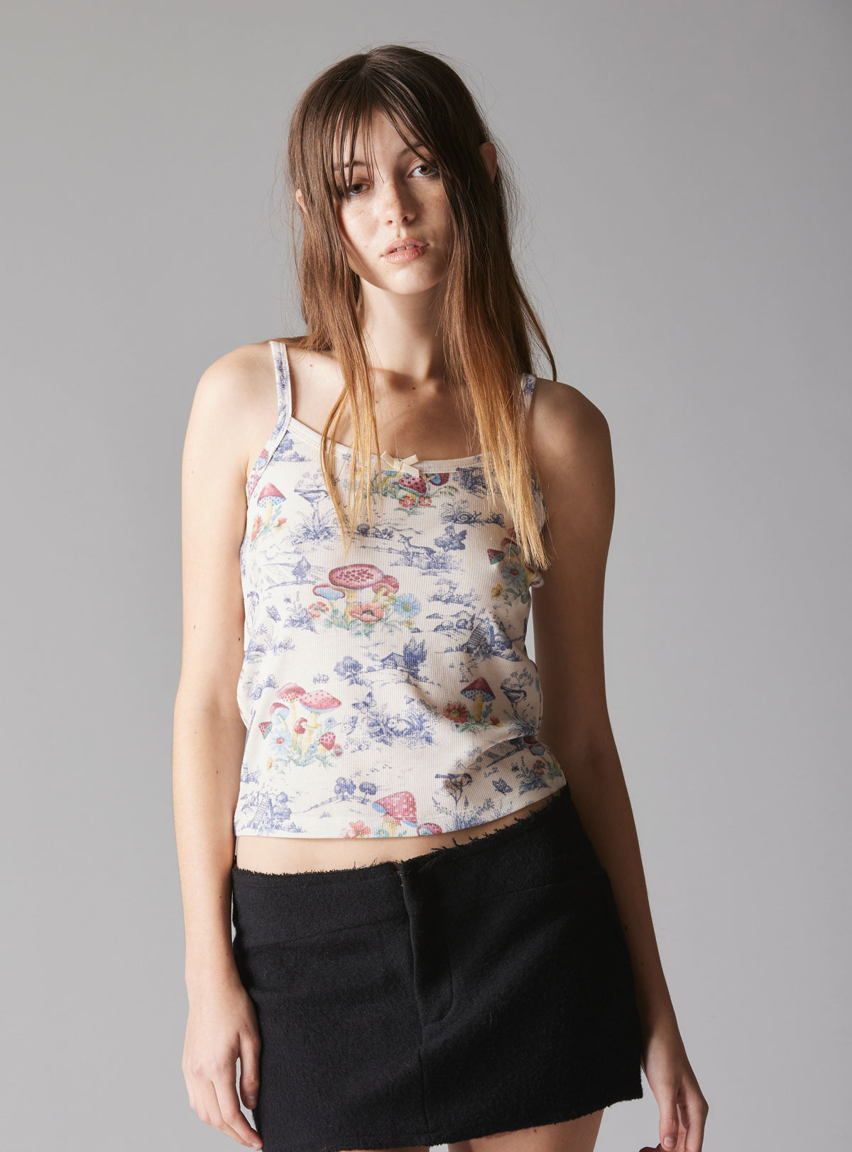 A lightweight ribbed tank top featuring an antique porcelain-inspired print, delicately adorned with mushrooms, snails, willows, deers, and other wild woodland creatures. The design captures the essence of nature in a vintage, artistic style. A charming center-front bow for a touch of femininity, and pairs perfectly with our matching pixie dream shorts for an ethereal, cottagecare look.