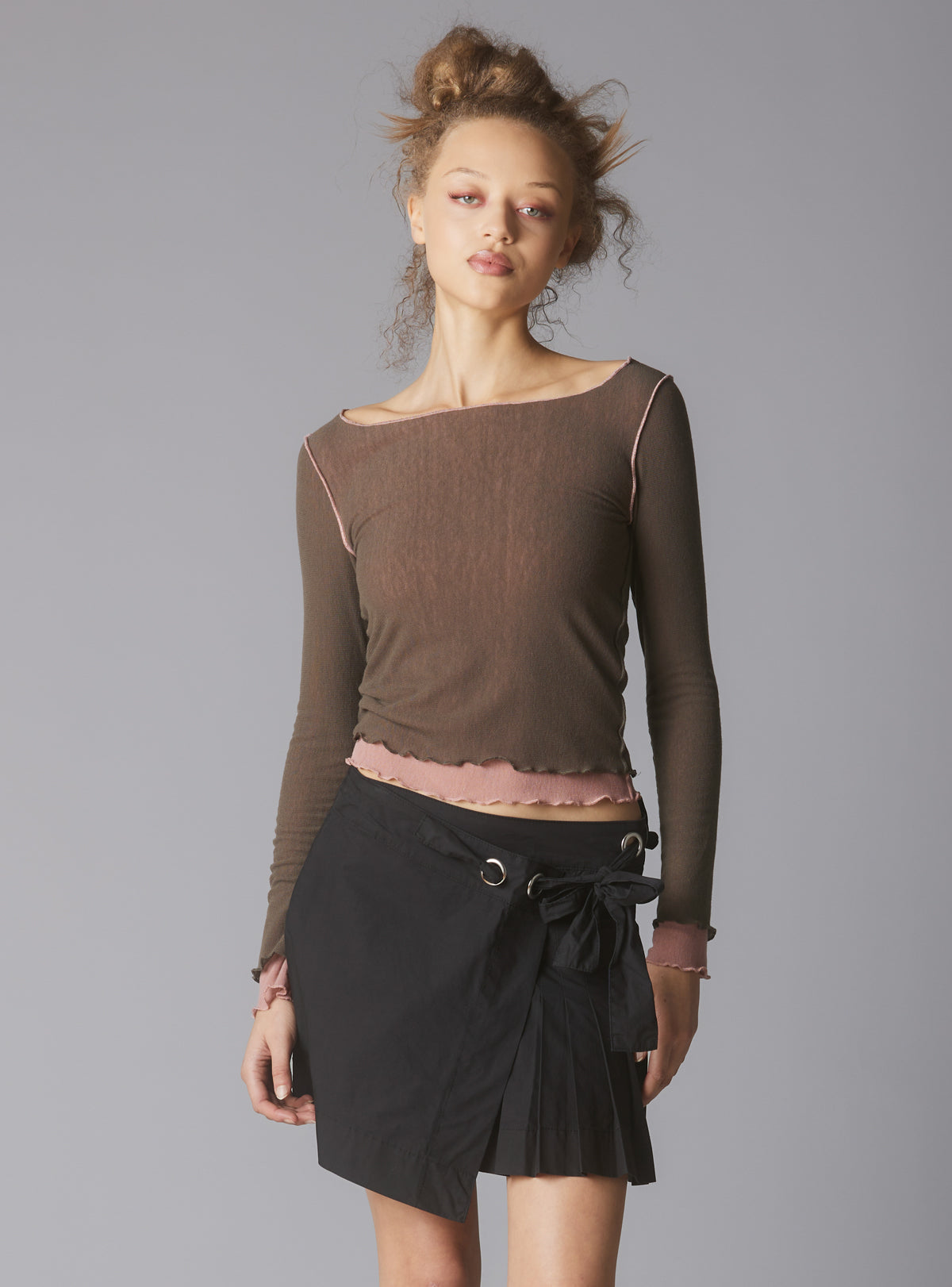 Double layered top with a lettuce hem and wide boat neck Model is 5'8" and wearing a...