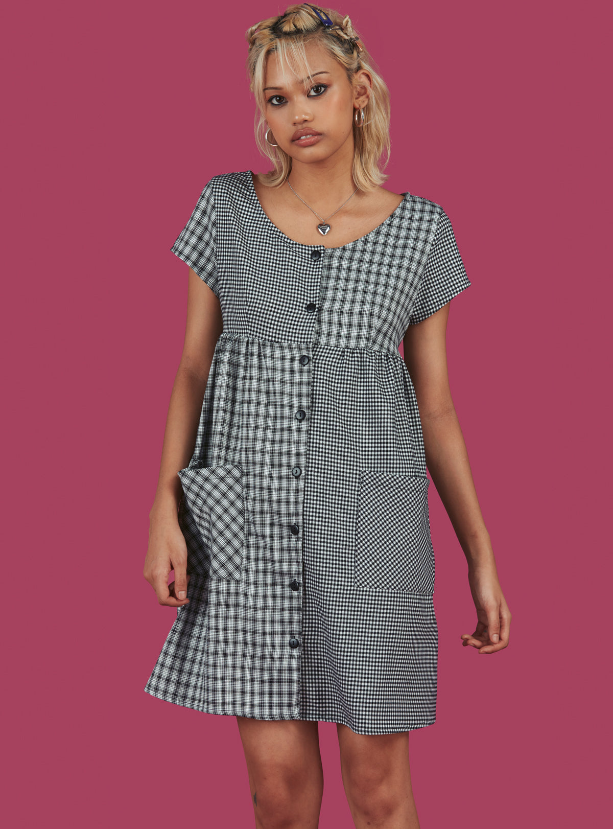 Put the pieces together in this multi-plaid patterned dress with oversized front pocket, full button front and ribbon tie-detailing at the back.