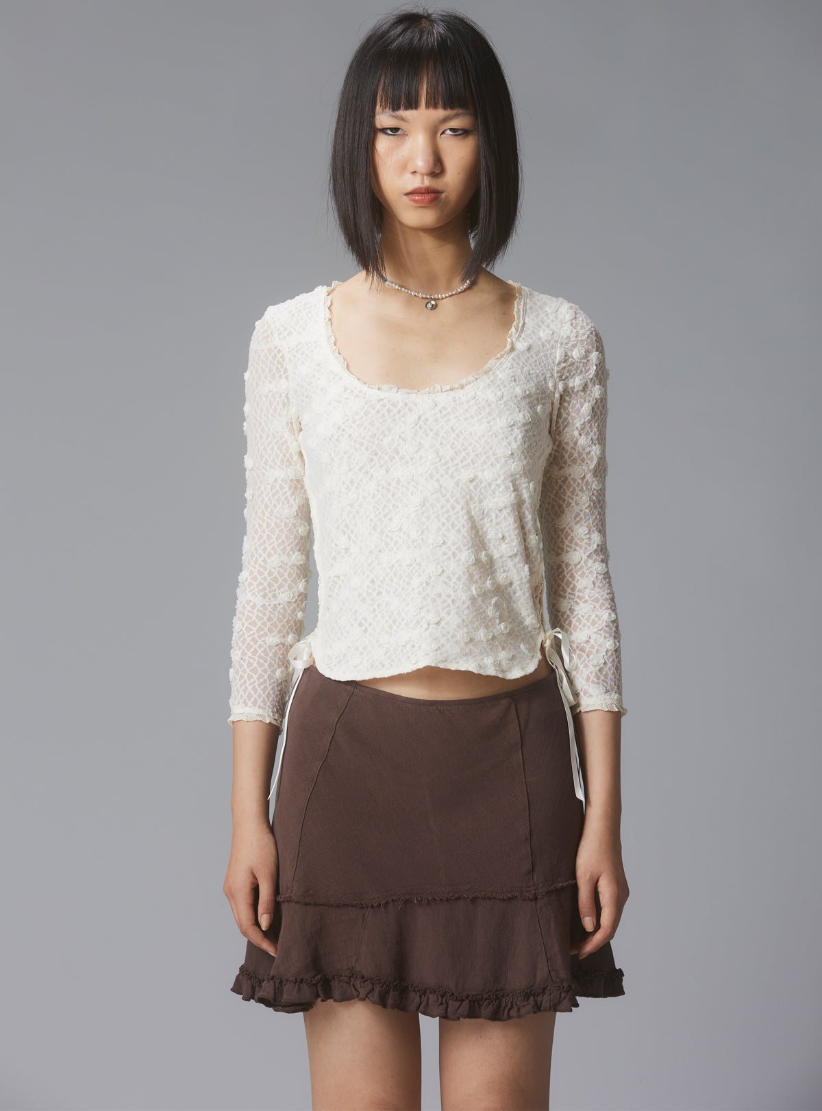 The Veldt Top is a double layered floral lace top with frilly trim and side ribbon lace-up detailing. Fit is true to size. Styled with the Rhizome Mini Skirt.
