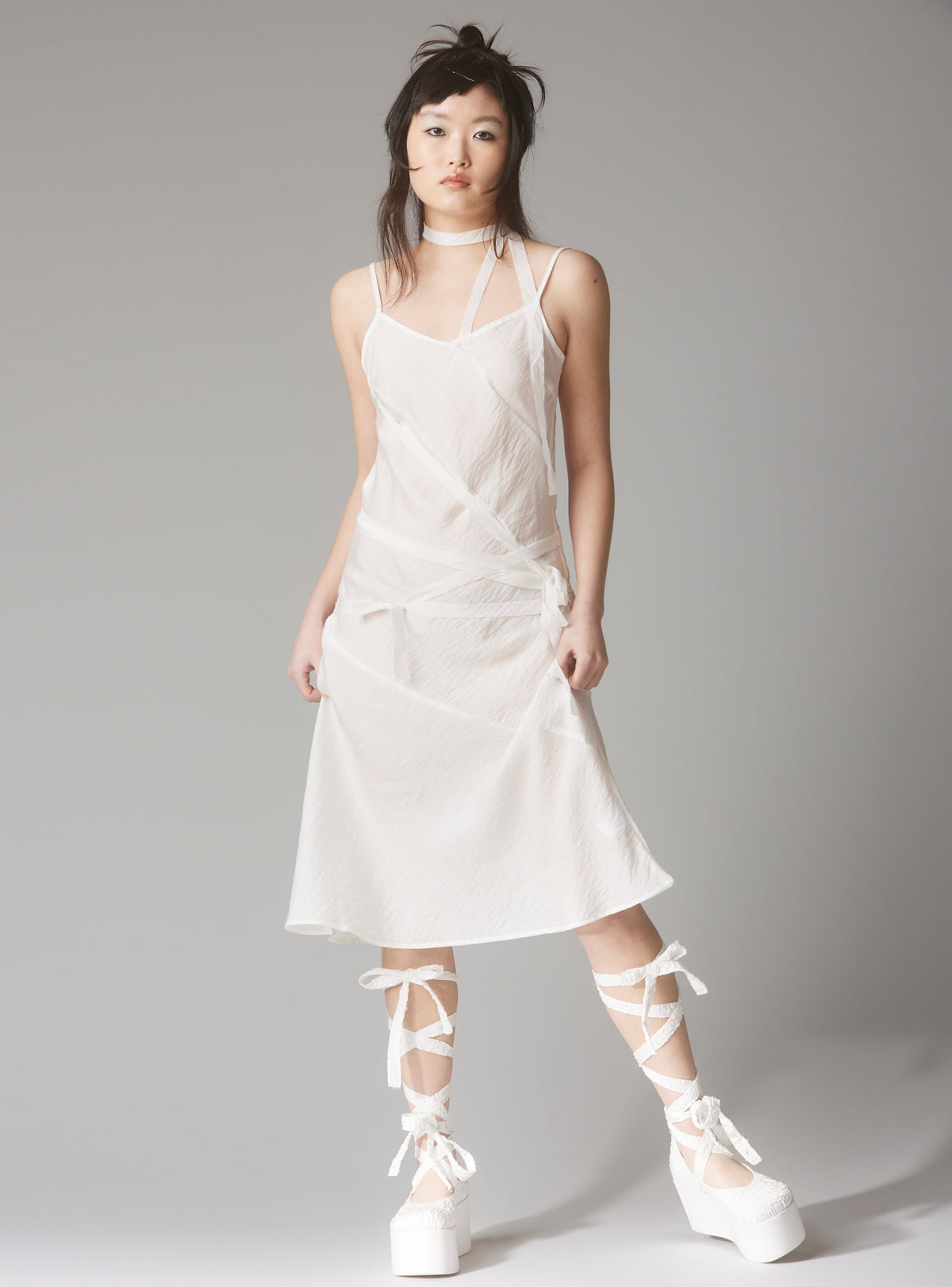 Simple slip dress with tailored seams and customizable straps. The slightly sheer material is a rayon/linen blend that has a light, and gauzy texture to it.